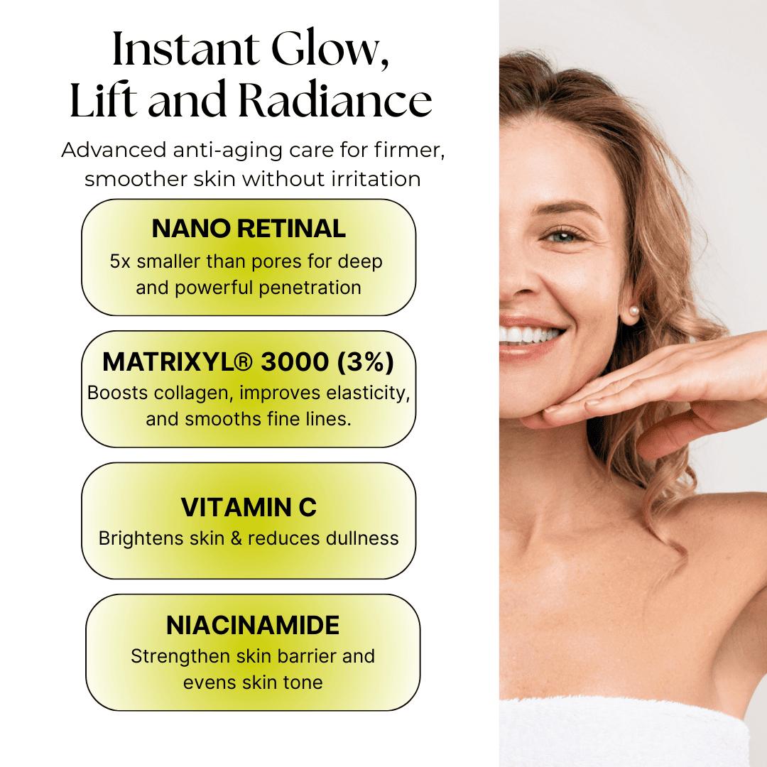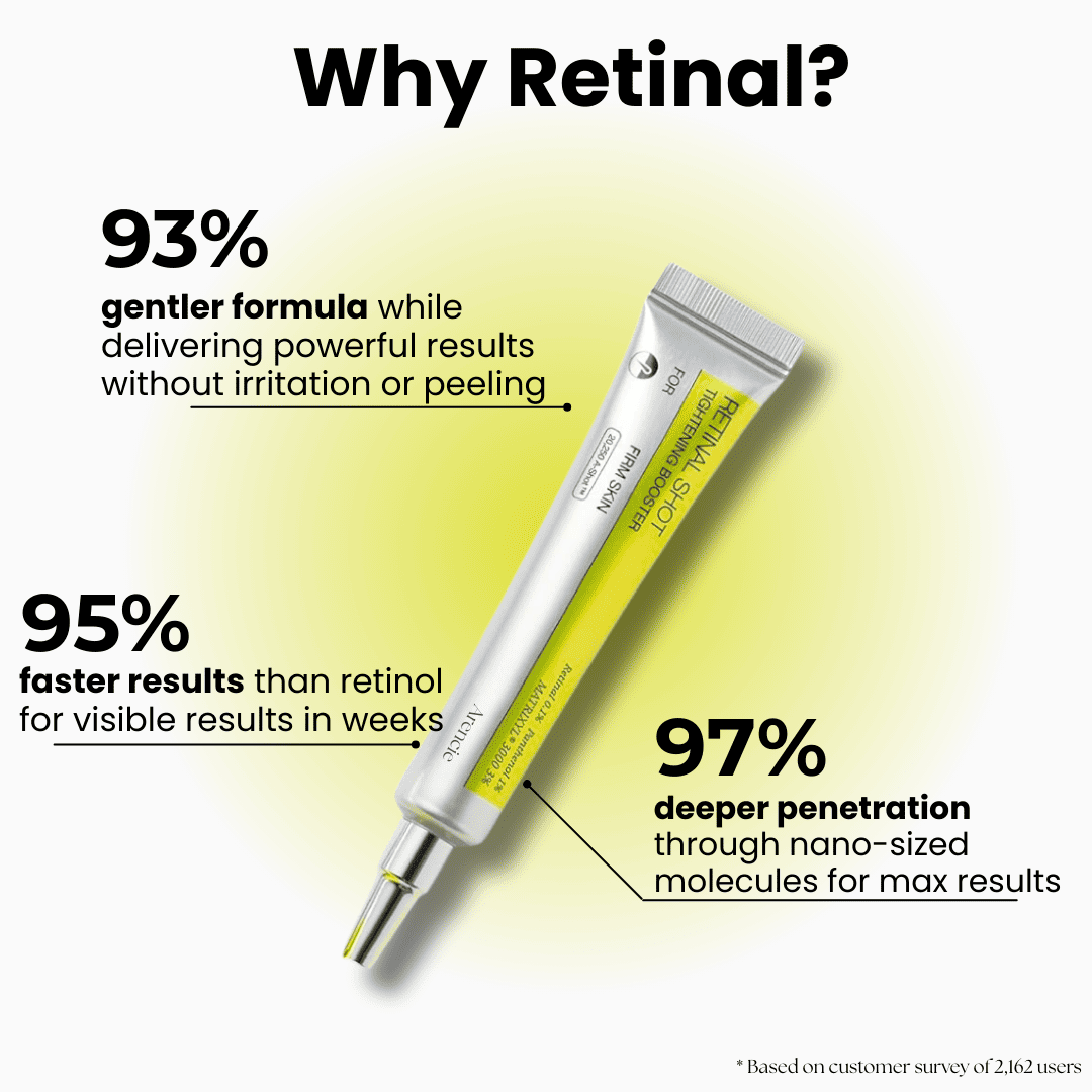 Our formula uses encapsulated retinal, which is significantly more stable than traditional retinol. This means it stays potent longer, delivers consistent results, and is less likely to cause irritation. We’ve also packaged it in an airless pump to protect it from light and oxygen — two things that usually degrade vitamin A products.